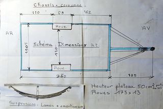 Chassis de caravane DE REU PTC 850 KG Remis en état, Peinture au blakson. Eclairage Bandeau AR refait à neuf. Suspensions : lames de ressort plus amortisseurs Bon état g