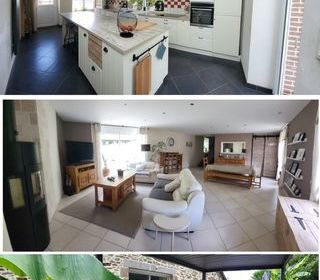 Ancienne longère entièrement rénovée par artisans en 2010. 200 m2 de surface habitable avec au RDC : grande cuisine très lumineuse avec accès terrasse, salon séjour avec accès ter