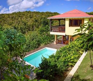 Villa colorée sur 2 niveaux, bien ventilée, avec piscine et donnant sur un très beau jardin tropical, située sur les hauteurs de Grand Bourg section Beaufils, proche des plages et