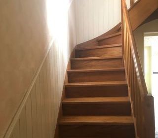 La maison mitoyenne se compose : Au Sous-sol : Cave Au rez-de-chaussée grand couloir, salon, séjour, grande cuisine, bureau, salle de bain véranda. Au 1er étage : 3 chambres de