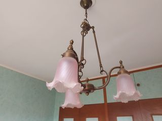 Vends lustre vintage à trois brois, avec abat-jours en verre rose pâle aux bords ondulés.style rétro élégant, parfait pour apporter une touche de charme et de douceur douceur a vot