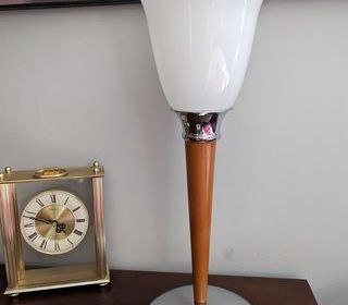 Ancienne lampe de bureau ou autre dite paquebot titan des années 80 avec socle et chapeau en métal chromé, pied conique en bois. Avec une tulipe en opaline blanche. Lampe très des