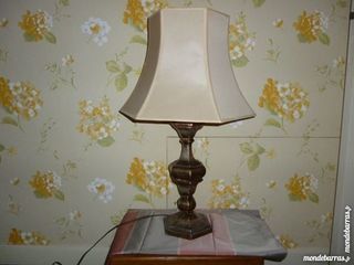 Lampe avec un abat jour forme pagode, couleur champagne, pied en bois patiné et ancien. Le système électrique fonctionne parfaitement. Hauteur du pied : 40 cm hauteur de l'abat j