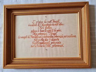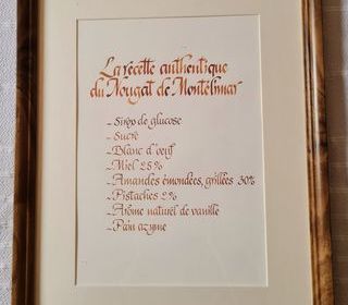 Ingrédients et composition du Nougat de Montélimar, en écriture calligraphique. Cadre dimendions : Long 43 cm Larg 32.5 cm Affiche dimensions : Long 33.5 cm Larg
