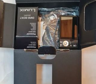 Appareil photo numérique Panasonic Lumix DMC-FZ18 proposé avec sa boîte d'origine, une sacoche de transport, une batterie, un chargeur, divers câbles, une carte mémoire, un CD, un