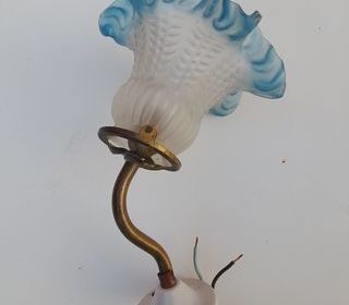 Applique 1900 standard, laiton, verre soufflé et porcelaine, complète. L : 27 cm. Prix : 25 €
