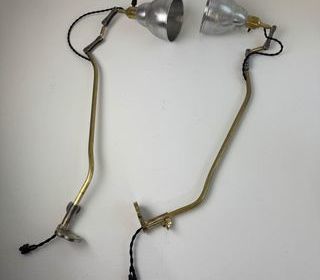 Rares appliques d'atelier en laiton, métal et aluminium signées " BEUNZA " L'une des bases est en laiton, l'autre en acier. Elles peuvent être articulées en tous sen. Douille à b