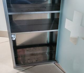 Haute armoire avec miroirs intégrés et 6 étagères. Hauteur : 220 cm. Largeur : 97 cm. Profondeur : 58 cm. A venir récupérer sur place.