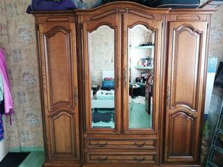 Bonjour, je vends une grande armoire en bois massif en assez bon état 100€ de dimensions 208x209x63 composée de 4 portes (2 pleines avec penderie et 2 glaces avec étagères) 2 tiroi