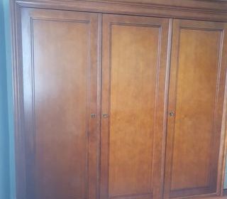 Vends armoire merisier massif fabriquée en France. Dimension : hauteur 190 cm, largeur 125 cm, profondeur 45 cm. Partie droite : 3 étagères réglables en hauteur, partie gauche pend