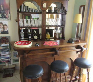 Un bar avec son armoire et trois tabourets - Bar : 2 étagères - Longueur 1.54 mètre - Largeur 0.50 mètre avec la barre d'appui - Hauteur 1.05 mètre - Armoire : 3 étagères et trois