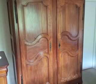Très belle armoire bretonne deux portes avec penderie , deux étagères et un tiroir Dimensions : hauteur 2m31 largeur 1m41 profondeur 59 cms