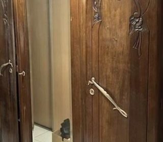 Chambre à coucher ancienne en bois massif. L'ensemble se compose de : 1 armoire 3 portes avec miroir central Dimensions : Hauteur : 200 cm Largeur : 140 cm Profondeur : 48 cm