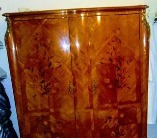 armoire ancienne en bois massif avec motifs floraux en marqueterie et ornements en laiton doré. Pièce élégante, idéale pour donner du charme à une chambre ou un intérieur de style