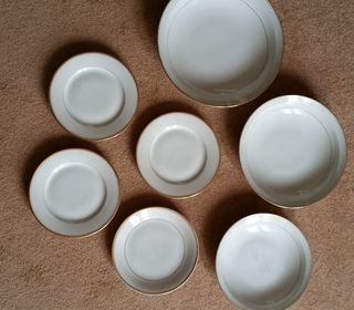 Service en porcelaine comportant 3 plats creux ( 26cm,23cm, 20cm ) 4 assiettes de 17,5cm Couleur blanche avec une lisière dorée. Porcelaine fine France