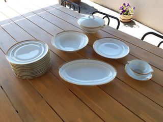 Elégant service en porcelaine qui apportera une touche vintage et sobre à vos repas de fête, ainsi qu'à ceux du quotidien. Service signé : Limoges Manufacture DRB (Descotte-Rebo
