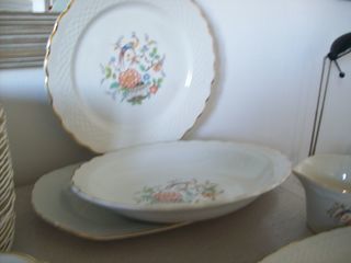 service de table des annees 1968 tres joli decor faience 2 beurriers 1 plat rond 1 plat a legumes 1 saladier 1 plat rectangulaire 12 assiettes creuses 24 assiettes plat