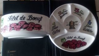 pour fondues Bourguignone & Savoyarde : ensemble de 12 assiettes compartimentées couleur brun flammé & 12 fouchettes-piques