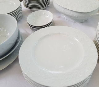Elégant service en porcelaine qui apportera une touche vintage et sobre à vos repas de fête, ainsi qu'à ceux du quotidien. Service signé : Limoges Manufacture Philippe Deshouliè