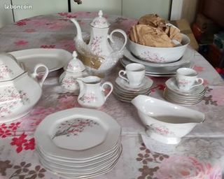 Vends un service en porcelaine de marque italienne Tognana qui comprend en totalité 84 pièces en très bon état : - 12 assiettes creuses - 12 assiettes dessert - 24 assisettes