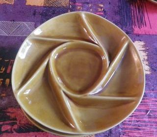 5 assiettes à fondue (+ 1 avec un éclat) à compartiment LONGCHAMP vintage céramique ocre jaune Années 70 Diamètre : 25 cm Prix : 30 euros Envoi possible à vos frais Remi