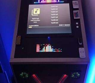 jukebox fait par moi de A a Z plan bois instalation etc bois 15 mm baguette alu anodisé ecran 19 pouces jeux de lumiere sous baguette alu dessous et les deux cotes j