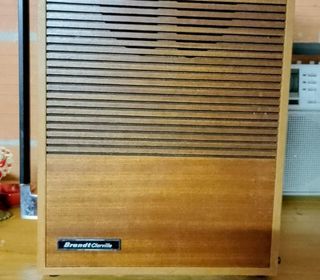 Un tourne disque portable, marque BRAND, couleur marron clair.