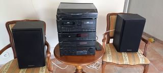 une chaine hi-fi complété avec les deux enceints de 120 w une platine DC servo automatique 33+ 45 tours double casette deck rs x 911 stéréo lecteur cd sl pj 27a lw/mw/fm stér