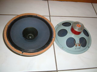 rare en 15 ohms, cette paire d'alnico A U D A X de 1965 en 21cm ,bicone, et en TBE d'origine. (199e la PAIRE) également des W F R (alnico 12) modèle de 1960 en 8 ohms,99e ? pièce