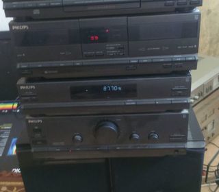 Bonjour Cède cet ensemble hi-fi Philips vintage TBE avec Lecteur cd ampli intégré tuner double cassette lecteur 2 enceintes tout philips