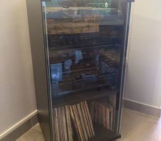 Chaine avec meuble comprenant un lecteur CD, un lecteur cassette, un tuner et un tourne-disques avec disques 33 et 45 tours (classique et variétés). 2 haut-parleur - marque Kenwoo