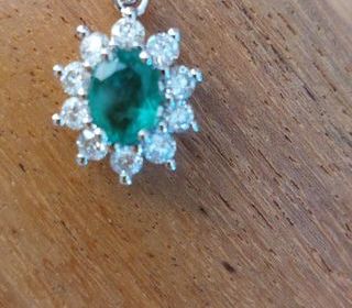 Pendentif émeraude sertie de 10 diamants. A l'origine c'était 1 bague que j'aimais pas.J'ai donc fais faire ce pendentif. Achat de la bague plus de 5000 euros chez 1 grand bijoutie