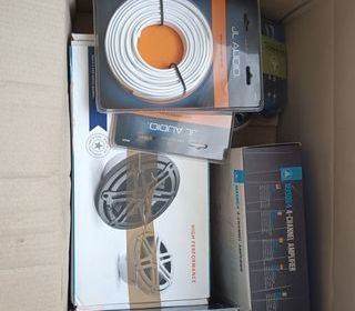 Lot Ampli JL AUDIO 4 voies 500w, 2 Haut parleurs JL AUDIO M3-770X-S-GM, 2 Connections XMD_WHTAIc2-3, 4 Fils JL AUDIO 7.6m. Le tout est neuf jamais servi