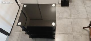 Meuble monté sur roulettes. Etagères en verre pouvant supporter 40 kg pour celle du dessus et 15 kg pour les autres. Hauteur 81 cm, longueur 60 cm, profondeur 45 cm.