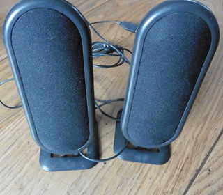 Hauts parleurs pour ordinateur Marque : Carrefour CS245 Connexion par prise JACK Alimentation par prise USB de l'ordinateur Dimensions : Hauteur=18,5 cm, Largeur=7 cm, Profonde