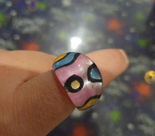 Bague très originale, en porcelaine blanche, agrémenté d'un motif doré et noir. Diamètre intérieur : 18 mm. Prix : 5.00 euros + frais d'envoi par Mondial Relay à la charge de l'