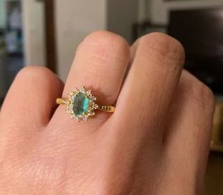 - bague neuve, véritable émeraude de Colombie, taille carrée 1,3ct, inclusions naturelles, entourée de zirconiums; certificat; - montée sur argent sterling plaqué or 18cts; - tai