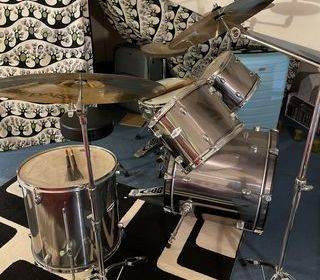Batterie pearl chromée, cymbale charleston et son pied, cymbale crash pearl et son pied, cymbale crash paiste et son pied, deux paires de baguettes, une paire de balais, un taboure
