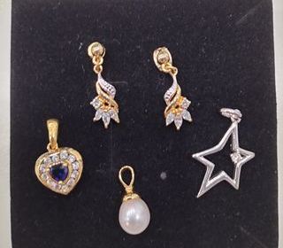 Ensemble de bijoux fantaisie comprenant deux paires de boucles d'oreilles et trois pendentifs. Les boucles d'oreilles sont dorées avec des motifs floraux et incrustations de petite