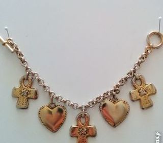 A vendre ce bracelet fantaisie avec des breloques en forme de coeurs ou de croix Longueur du bracelet = 18 cm Hauteur des breloques = 2,8 cm Très bon état