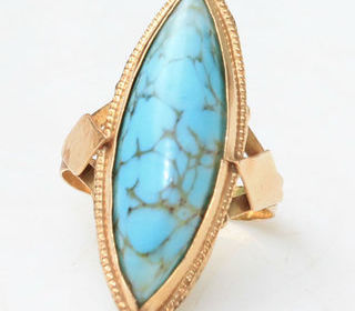 Très jolie bague marquise en or jaune 18 carats sertie d'une belle pierre de turquoise. Poinçonnée tête d'aigle Plateau 3 cm x 1,3 cm environ, largeur de l'anneau 0,4 cm, taille