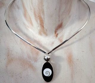 Vintage Tour de cou design sobre et élégant Collier ras de cou en argent massif, poinçonné 925 au verso, bois et ?il de Ste Lucie Ce collier s'ouvre et se ferme sur le devant