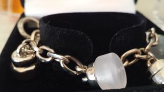 TRÈS JOLI BRACELET SIGNE "GALENIC"FANTAISIE . MÉTAL BLANC . CRÉATEUR BRELOQUES " DISING ACTUEL" SERTIE DE CINQ PETITS POTS, NE BOUGE PAS DANS LE TEMPS . ALLURE ET STYLE BOHÈME