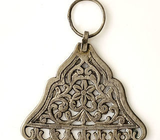 Très ancien grand pendentif ciselé floral en forme de triangle probablement en métal argent Je n'ai pas vu de poinçon Triangle 6 cm sur 7,2 cm Hauteur avec l'anneau 8 cm Poids