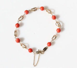 Bracelet en or jaune 18 carats poinçonné et perles de corail orange Très peu porté Chainette de sécurité en or Longueur 19 cm Poids 5,8 grammes Les photos font partie intégr