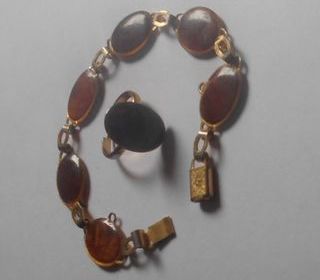 - bracelet "métal doré" avec 6 motifs de forme ovale, plats, en bois précieux (loupe d'orme), fermoir qui se clipse (longueur 19 cm). 1 petit anneau doré à chaque extrémité du brac