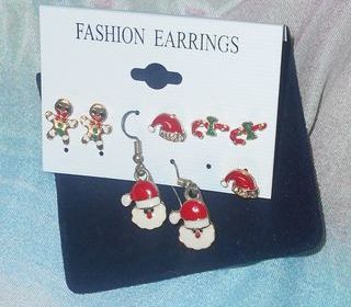 4 paires de boucles d'oreilles sur présentoir "fashion earrings", neuves : - pains d'épice de Noël en forme de bonhomme, bonnets de Noël rouge avec brillants, canne rouge du père