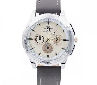 montre homme fond blanc créme, avec trois cadran factice, pour effet chrono et son bracelet cuir de couleur gris piquré. marque Michael JOHN boitier métal doré brillant de