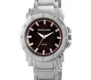 montre homme fond marron brillant et index des minutes bâton de couleur argenté brillant et son bracelet acier inoxydable de couleur argentée brillant. marque excellanc Le