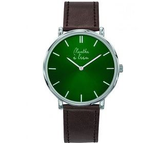 montre mixte fond vert et index des minutes bâton argenté brillant bracelet cuir de couleur marron. modéle: l'indécise marque Menthe à l'eau boitier métal finition chro